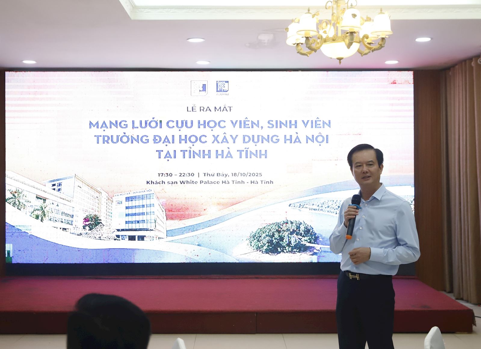 dich: RA MẮT MẠNG LƯỚI CỰU HỌC VIÊN, SINH VIÊN TRƯỜNG ĐẠI HỌC XÂY DỰNG HÀ NỘI TẠI TỈNH HÀ TĨNH Ngày 18/10/2025, Chương trình Lễ ra mắt Ban Liên lạc Cựu sinh viên, học viên Trường Đại học Xây dựng Hà Nội tại tỉnh Hà Tĩnh đã diễn ra thành công tốt đẹp. Tham dự Sự kiện có PGS.TS Hoàng Tùng - Hiệu trưởng, GS.TS Nguyễn Hoàng Giang - Phó Hiệu trưởng, đại diện lãnh đạo các Khoa, Phòng, Ban trong Trường. Đại diện Mạng lưới Cựu sinh viên, học viên Trường ĐHXDHN tại Hà Tĩnh có: Ông Trần Báu Hà - Phó Chủ tịch UBND tỉnh Hà Tĩnh; Ông Đặng Văn Thành - Giám đốc Sở Xây dựng; Ông Hoàng Thanh Tùng - Phó Giám đốc Sở XD; Ông Dương Thành Trung - Phó Giám đốc Sở XD; Ông Tô Thái Hòa - Chủ tịch UBND phường Hà Huy Tập; Ông Nguyễn Duy Đức - Giám đốc Ban QLDA ĐTXD Công trình giao thông và phát triển đô thị tỉnh Hà Tĩnh; Ông Trần Xuân Tiến - Nguyên Giám đốc Sở Xây dựng Hà Nội cùng đông đảo các anh/chị cựu sinh viên, cựu học viên Trường ĐHXDHN đang công tác, làm việc tại tỉnh Hà Tĩnh. Tại Sự kiện, TS. Nguyễn Tiến Dũng - Trưởng phòng Đối ngoại & Hợp tác Quốc tế đã giới thiệu một số nội dung về việc xây dựng Mạng lưới Cựu sinh viên Trường ĐHXDHN và công bố Quyết định công nhận Ban liên lạc Cựu học viên, Sinh viên Trường ĐHXDHN tại tỉnh Hà Tĩnh. Thay mặt lãnh đạo Nhà trường, PGS.TS Hoàng Tùng - Hiệu trưởng Nhà trường đã trao Quyết định công nhận, GS.TS Nguyễn Hoàng Giang - Phó Hiệu trưởng tặng hoa chúc mừng Ban Liên lạc. Chương trình ra mắt Ban Liên lạc Cựu sinh viên Trường ĐHXDHN tại Hà Tĩnh là hoạt động mở đầu cho hoạt động kết nối các Ban Liên lạc Cựu sinh viên và hướng đến các hoạt động chào mừng kỷ niệm 60 năm thành lập Trường ĐHXDHN (1966 - 2026).