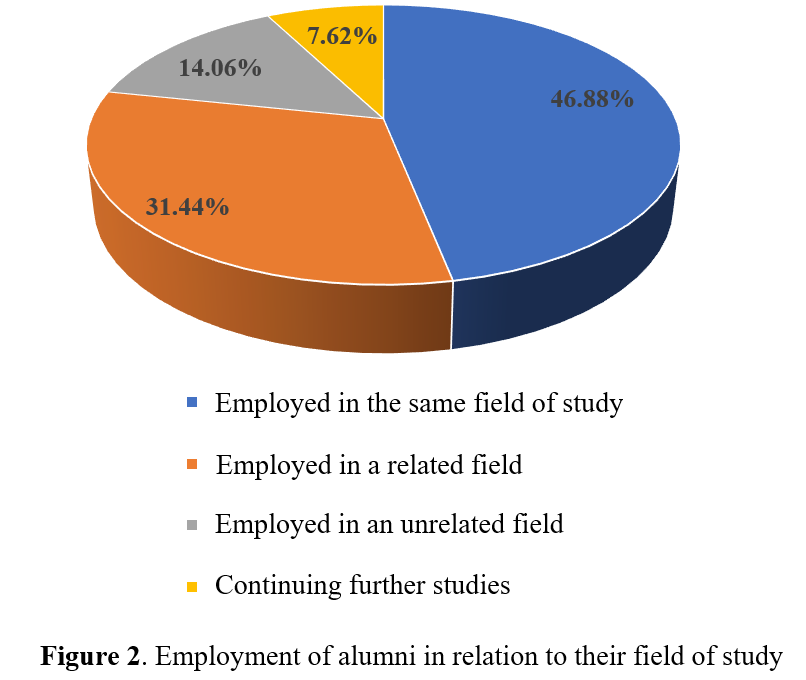 Among 2,020 respondents who reported being employed, 947 alumni are working in positions directly related to their field of study; 635 alumni have jobs related to their major; 284 alumni are working in fields unrelated to their training; and 154 alumni are continuing their studies. The survey data are illustrated in Figure 2.