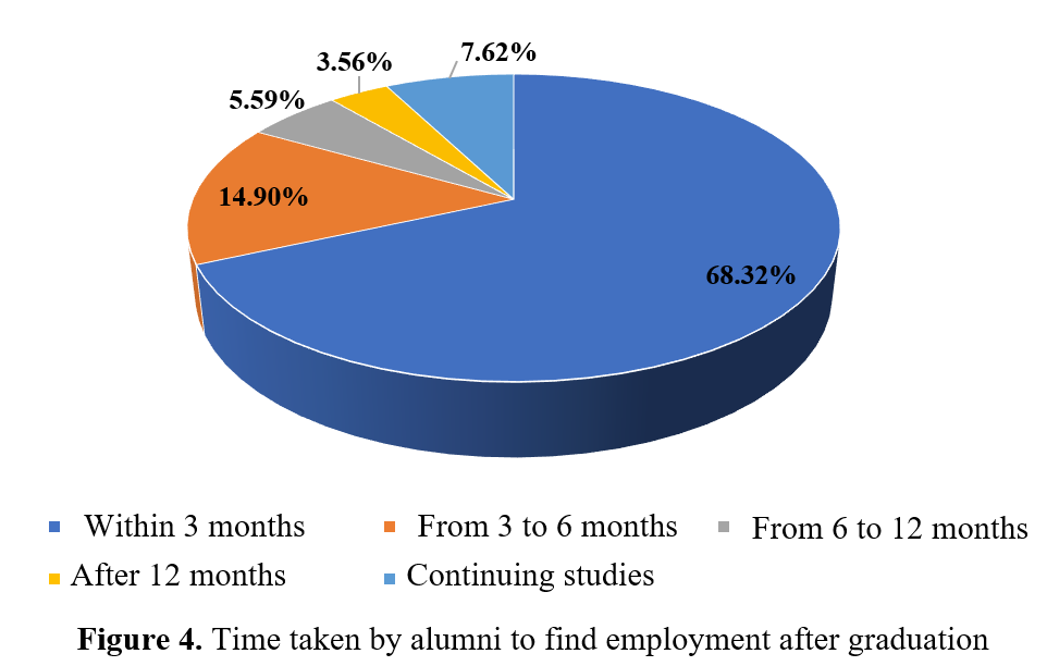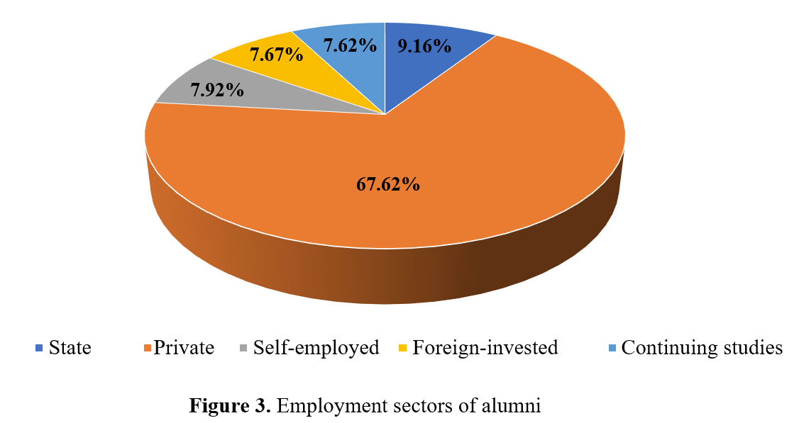 According to the survey results, 1,366 alumni are working in private organizations; 155 are employed in foreign-invested sectors; 185 are working in state agencies; 160 alumni are self-employed; and 154 alumni are continuing their education. The data are shown in Figure 3.