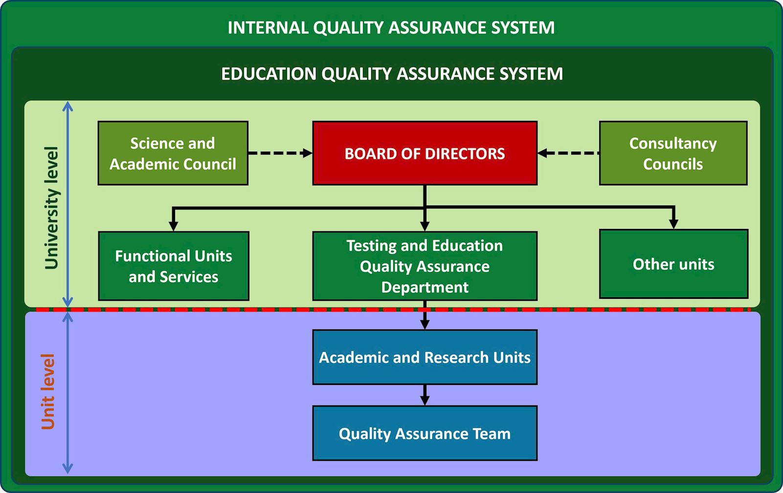 The Testing and Quality Assurance Office serves as the central specialized unit, coordinating with a network of 14 QA teams comprising 78 staff members from various faculties and academic groups to implement QA activities at the unit level.